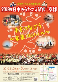 “京都のうたごえ70周年記念 2019年日本のうたごえ祭典・京都”は、11月30日ロームシアター京都メインホールで3つの音楽会、ノースホールで全国うたごえ喫茶交流会、ロームスクエアでは32団体によるパフォーマンス広場。11月29日と12月1日は全国から推薦された7部門での合唱発表会とオリジナルコンサートに310団体が出演し、のべ16,500人の参加で行われました