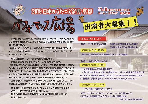 ●2019/11/07 パフォーマンス広場ニュースNo8NEW 当日のプログラムが決まりました。●2019/10/22 パフォーマンス広場ニュースNo6 エントリー団体は31に