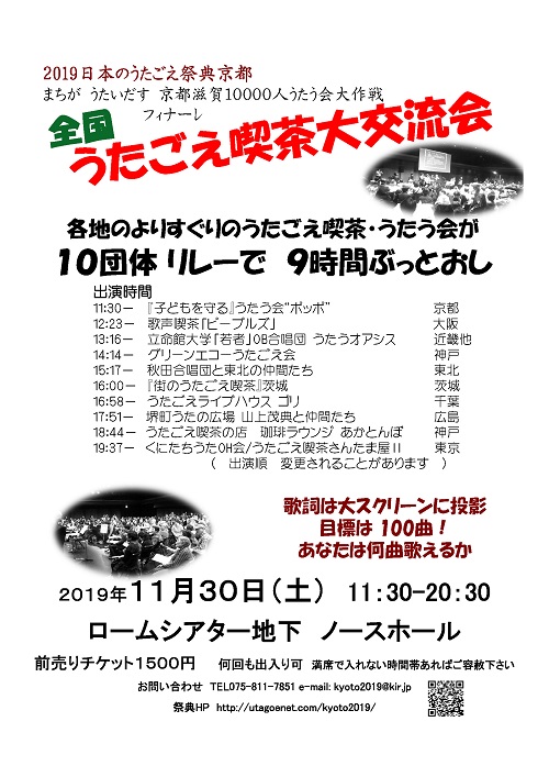 ●2019/11/07 全国うたごえ喫茶大交流会ニュース11.7号●2019/09/20 前売りチケットは予定枚数に達しましたので、販売を終了いたしました。NEW